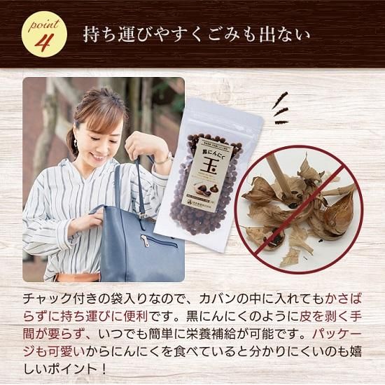 携帯しやすいチャック付きの袋入りで、黒にんにくをもっと手軽に摂りたい方におすすめです。
